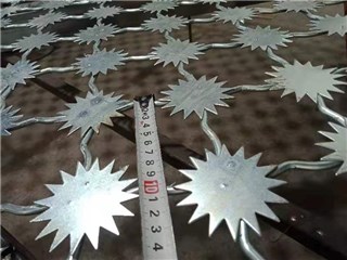 梅花型隔離網是單層梅花刺網,梅花刺直徑不小于7.5cm,刺片厚1.5mm,采用Q235低碳鋼板沖壓而成,網片為鋼絲焊接而成的菱形網孔網片,一般網孔為110*110mm,網絲直徑一般為5mm,每一個網絲的交叉點焊接一個梅花刺。