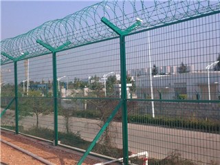 機場圍界護欄網是由折彎型網片和Y型立柱主要組成,上面安裝有熱鍍鋅刀刺滾籠,強度和安全防御級別很高的護欄網產品。機場護欄網被廣泛應用于機場、邊界、軍事基地、監獄等高安全場所。